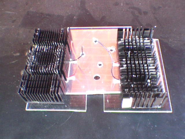 Closeup of the cooling unit showing the two heatsinks (fans removed) bolted onto the hot sides of