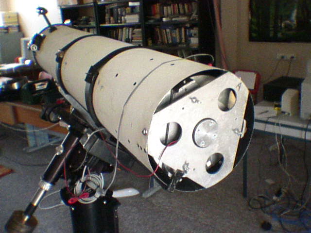 The mirror cell back in the scope with the aluminium plate and cylinder fitted. The mirror sits on the plate with lots of thermal paste applied to help the transfer of heat from the mirror to the plate. More thermal paste was used between the plate and the central cylinder. Update Due to concerns about inducing astigmatism with the cold plate directly touching the mirror, I have swapped the location of the cold plate and flotation points around so that the mirror now sits on its flotation points again, and these points in turn are anchored to the cold plate. That leaves a gap of about 3mm between the back of the mirror and the cold plate. I'm happy to say that after testing the new arrangement I am still getting excellent results, showing that the cold plate doesnt have to actually touch the mirror to work. |