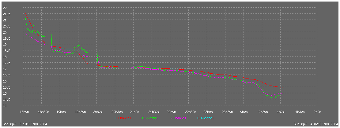 The cooler was switched off when the mirror temp approached ambient (about 1840). This is when I discovered that my heavy-duty 12v power supply caused enough of a voltage spike to crash the temperature logger whenever it was turned on or off :-( (hence the gaps in the graph).